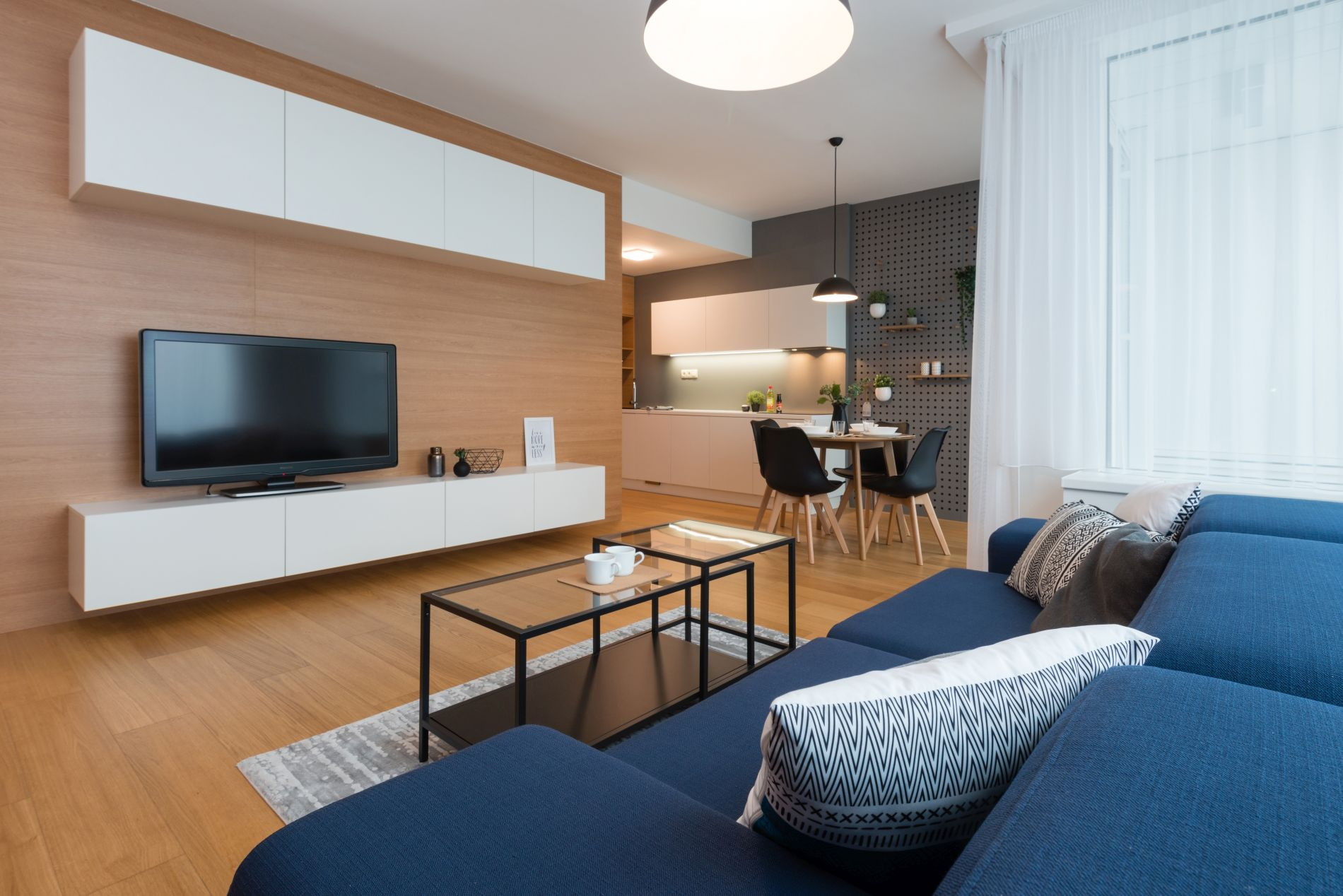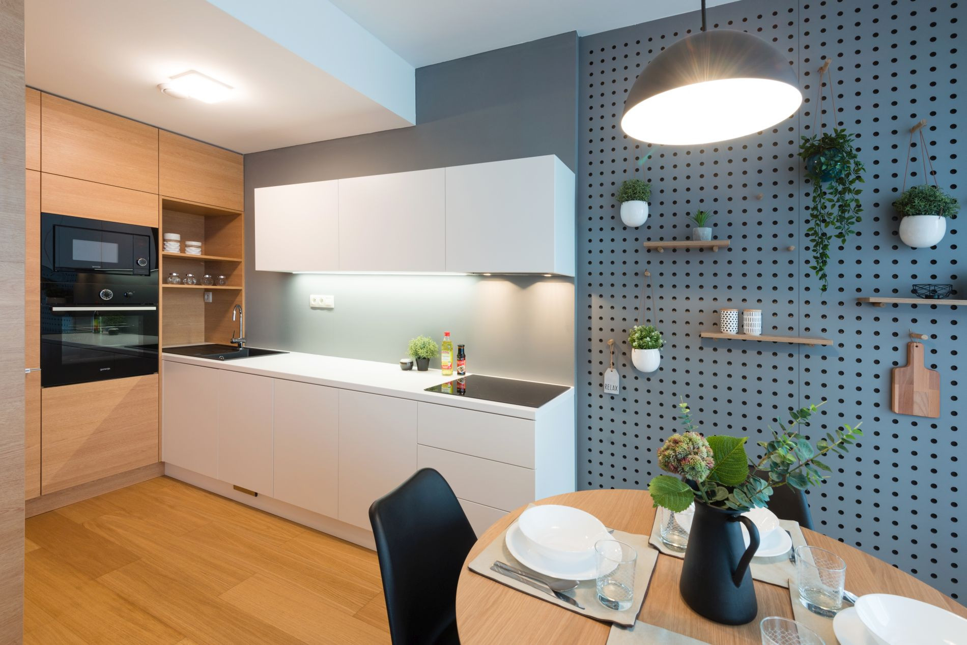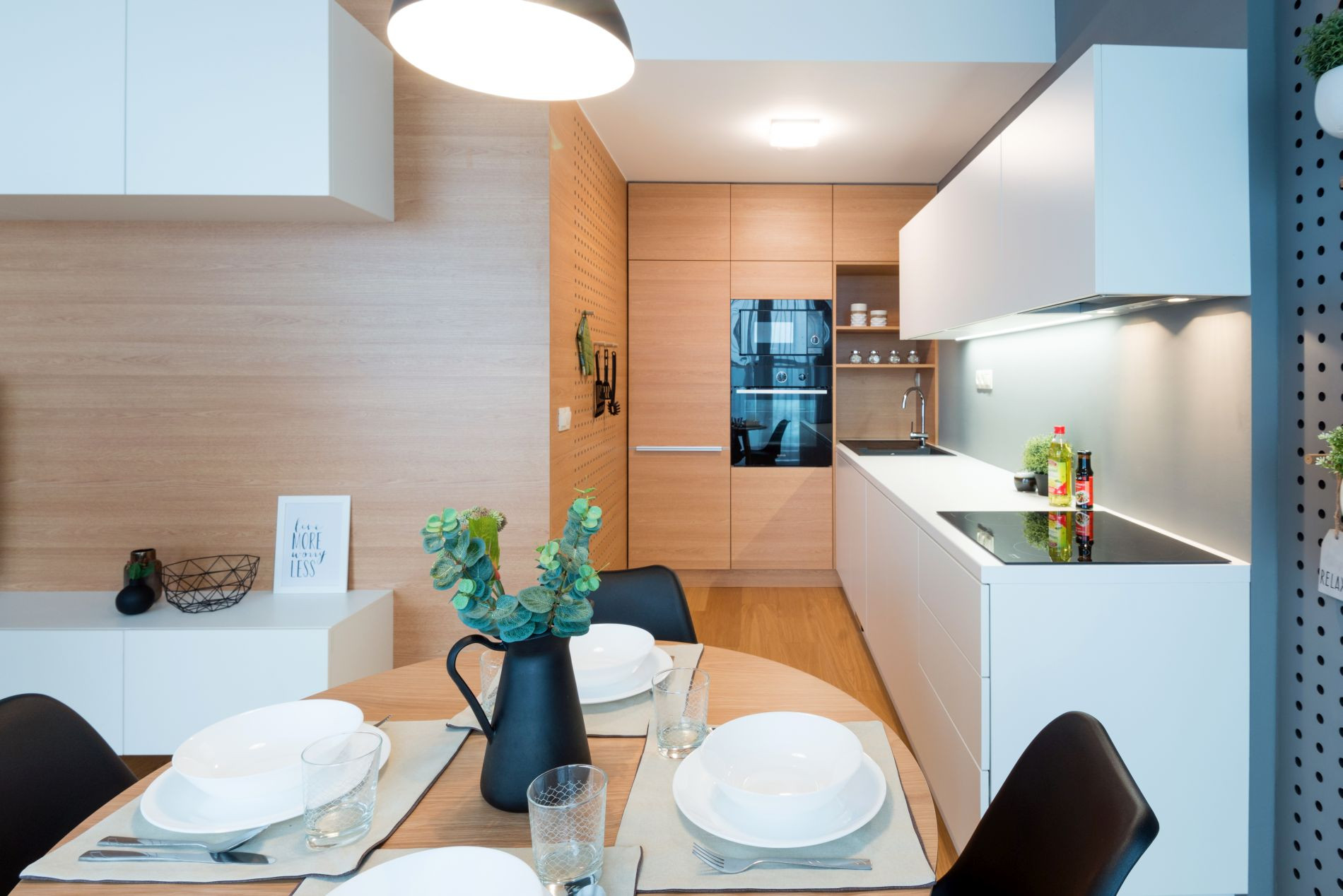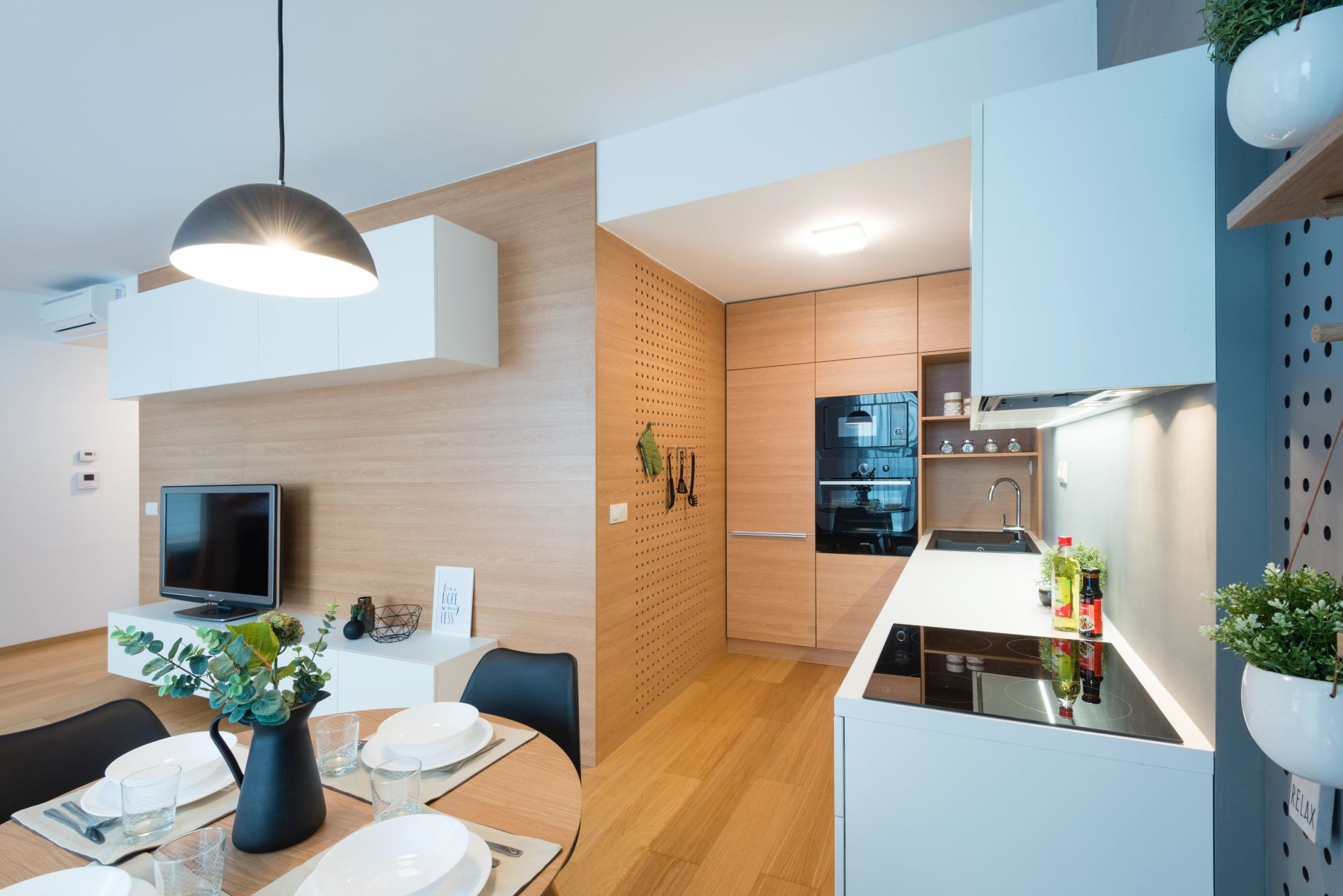 Dvojizbový byt v Panorama city si majiteľ vyhliadol na prenajímanie. V čase keď nás navštívil, mal už od kuchynského štúdia hotový návrh kuchyne. Jeho prvotné zadanie preto smerovalo k zladeniu tohto návrhu s ostatnými časťami bytu. Keďže je kuchyňa spojená s obývačkou, bola by škoda, aby oba priestory materiálovo a farebne spolu neladili. Po spoločnom rozhovore sme sa preto dohodli, že do projektu zapracujeme aj náš návrh kuchyne a konečné rozhodnutie, ktorý z návrhov si vyberie, necháme na neho. A vybral si ten náš.
