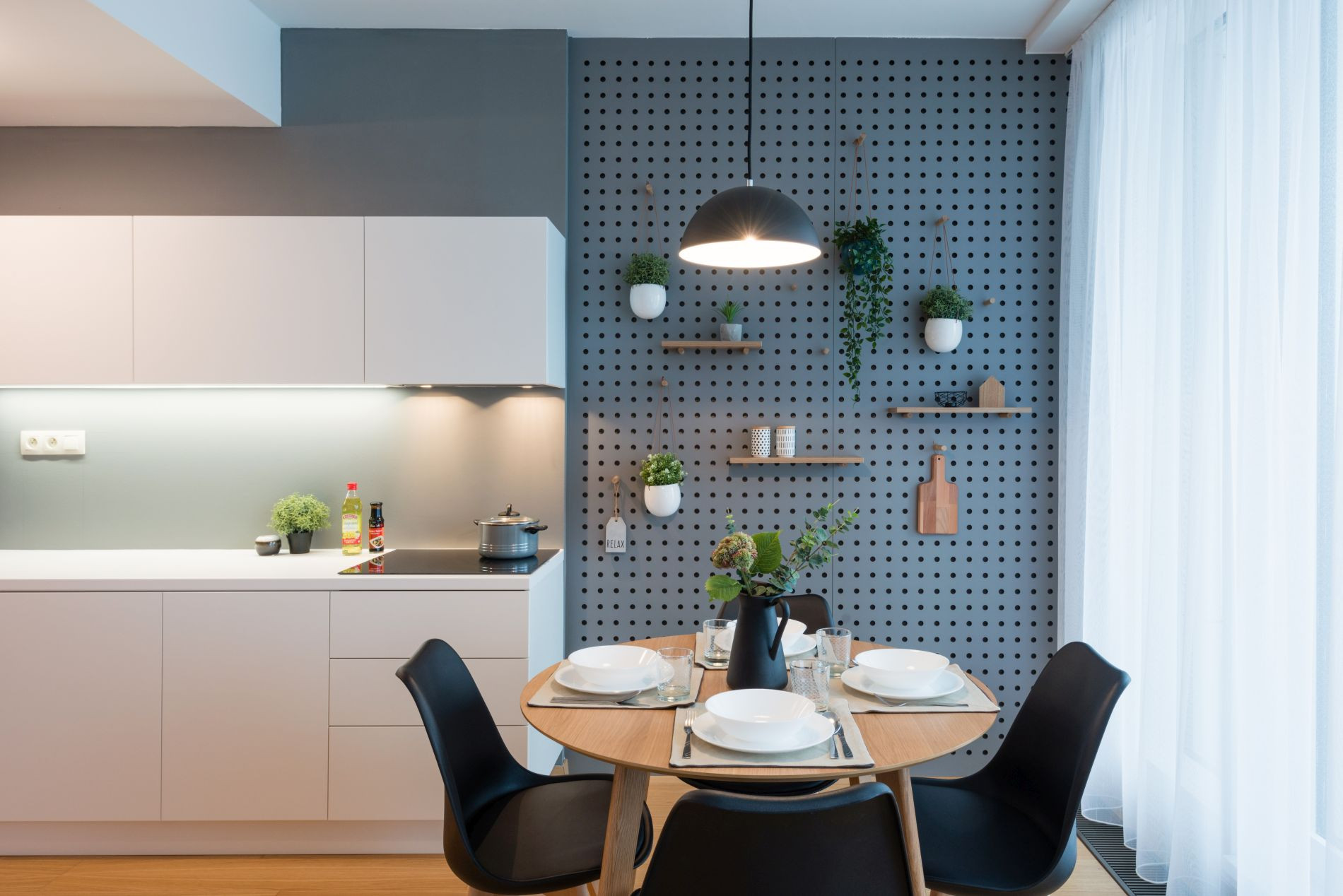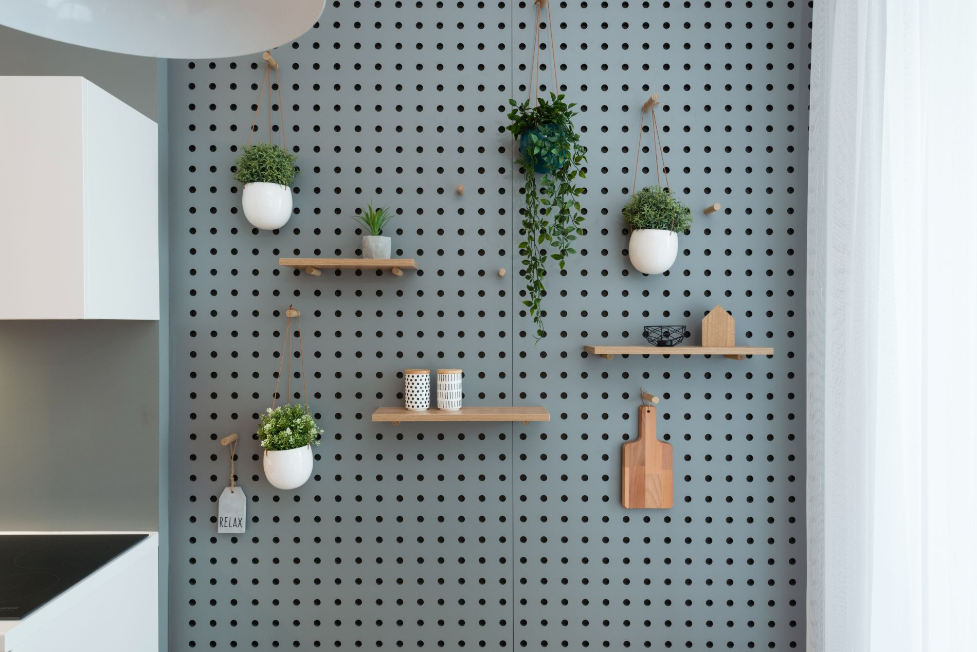 Výrazným prvkom celého interiéru sú perforované obklady stien, ktoré majú rôzne využitie. Slúžia ako vešiaky na kabáty a tašky. V kuchyni sú poruke napríklad na zavesenie kuchynského náradia či utierok a pri jedálenskom stole sa premenia na poličkovú zostavu, ktorá slúži buď ako dekorácia spolu s kvetináčmi alebo môže byť použitá ako plocha pre odkladanie koreničiek, olejov či iných potrebných drobností k stolovaniu. Výhodou je, že jednotlivé prvky je možné presúvať a meniť podľa potreby.