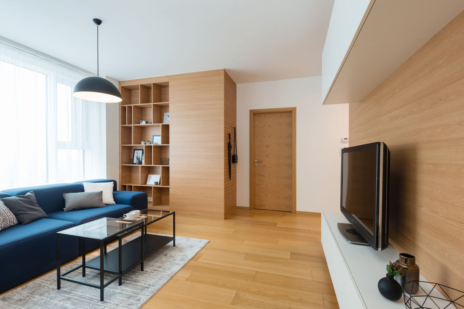 Farebnosť návrhu vychádza z dubovej podlahy, ktorú si klient vybral už predtým kvôli jej príjemnej farbe. Väčšina nábytku je preto v rovnakom drevodekore, ktorý sme doplnili neutrálnymi farbami – sivá, biela a čierna. Týmto spôsobom sme vyzdvihli jednotlivé detaily bytu, ktoré ho robia unikátnym.