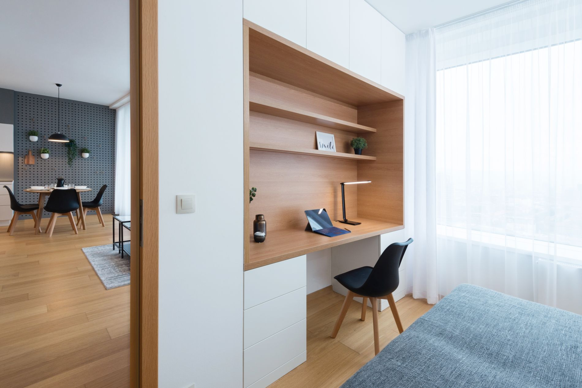 Celkový návrh interiéru sme koncipovali tak, aby sa v byte pohodlne cítili dve osoby. Využitím nábytku na mieru sme vytvorili aj v relatívne malom byte množstvo úložných priestorov a zároveň docielili jeho vzdušnosť. Vzniklo tak pohodlné stolovanie pri jedálenskom stole, v spálni zas pekný pracovný kútik s dostatkom komfortu na prácu z domu.