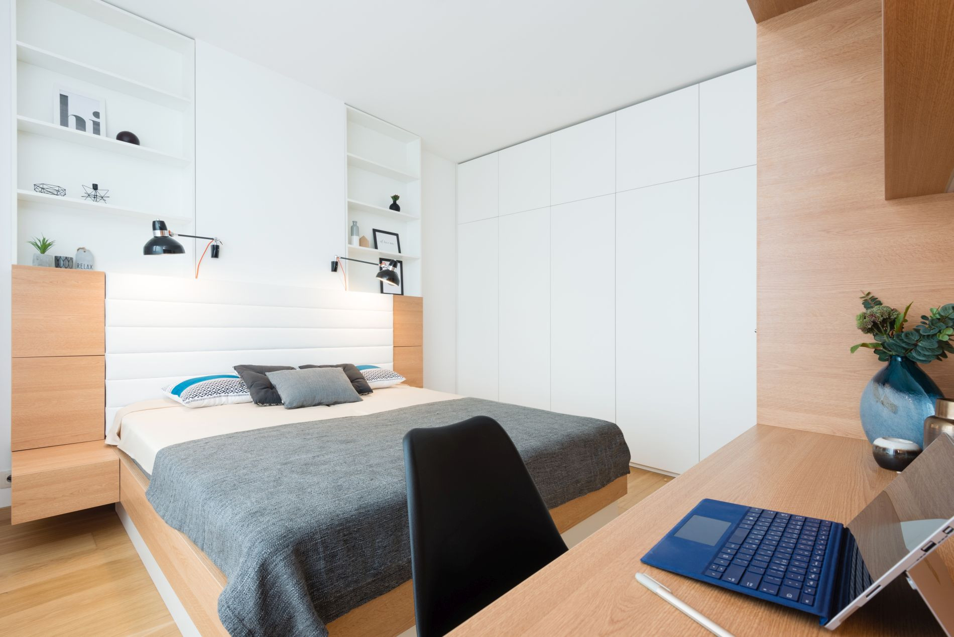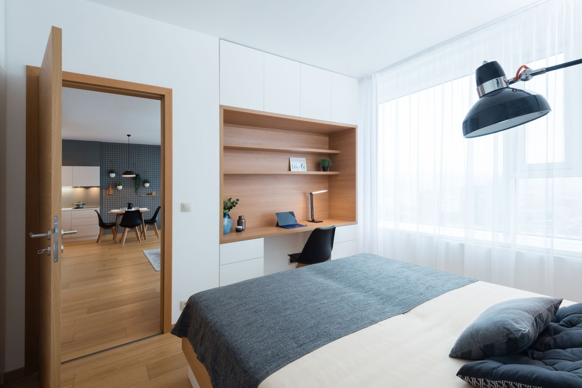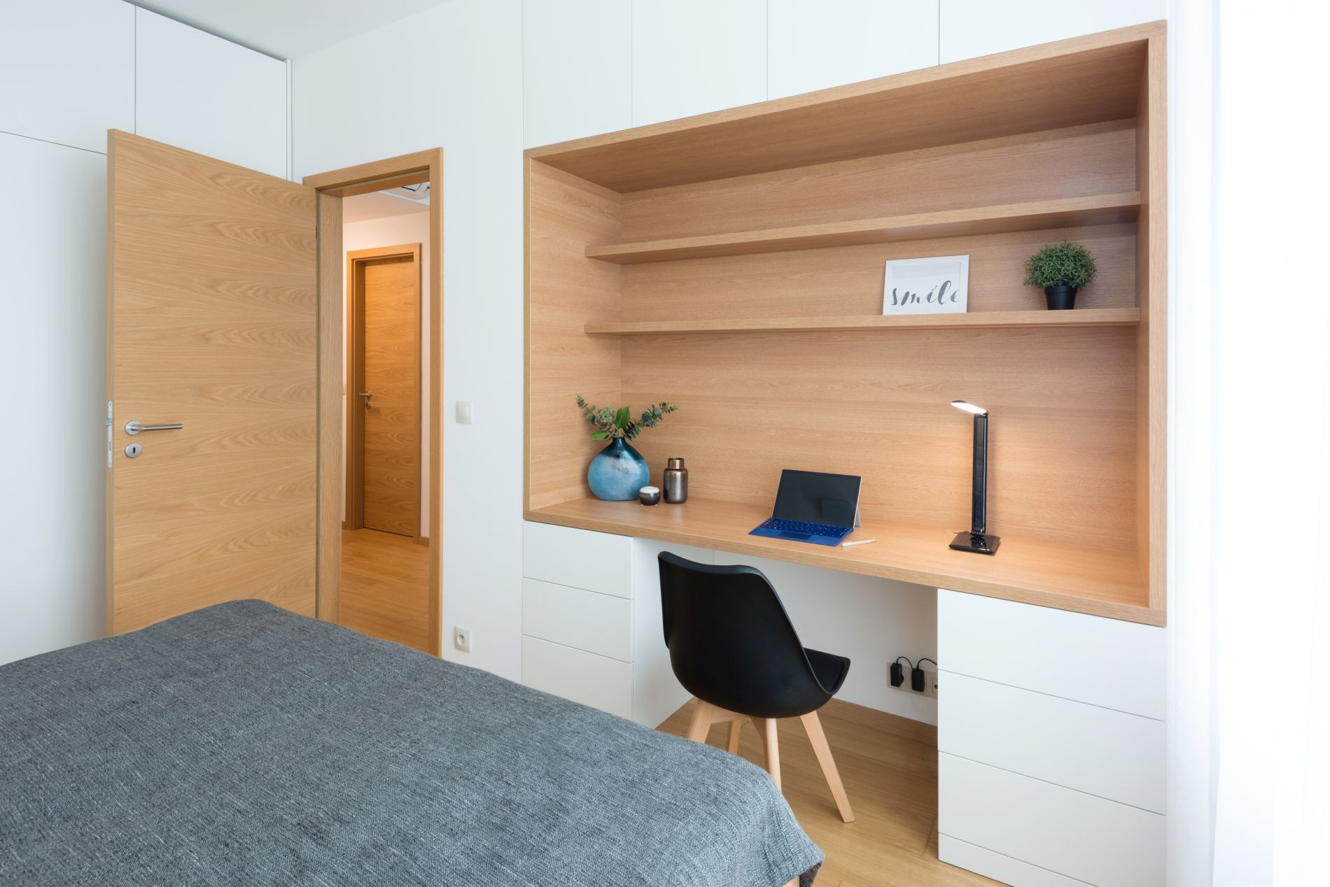 Spálni dominuje čalúnená posteľ, ktorá zároveň poskytuje dostatok odkladacieho priestoru, ktorý môžu budúci nájomíci využiť na uloženie rozmernejších predmetov. Súčasťou sú aj nočné stolíky s odkladacími plochami. Úložný priestor je rovnako chytro zakomponovaný aj v pracovnkom kútiku ako aj vo veľkej skrini pozdĺž steny a tiež v chodbe pri vstupných dverách.